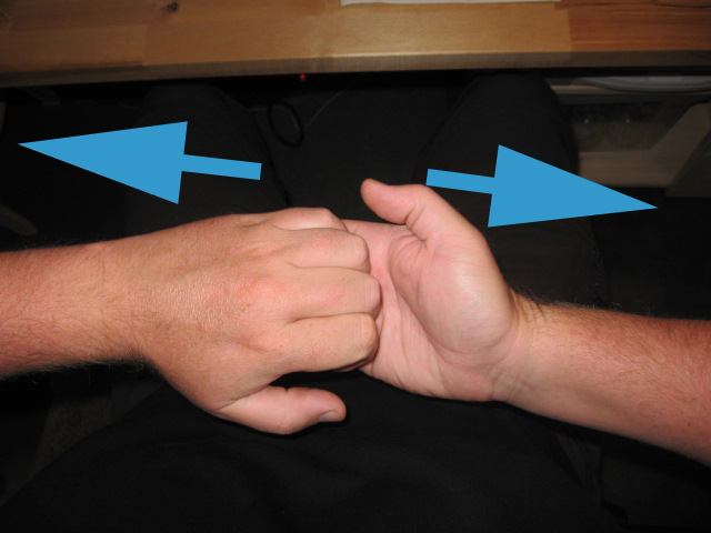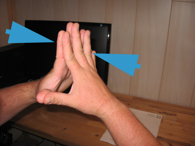 Drücke nun die Endglieder jedes Fingers mit den Fingern der anderen Hand zusammen, sodass sich die Handflächen nicht berühren. Du solltest nun eine merkbare Dehnung an deinen Fingern und der Handfläche fühlen. Die Spannung (mit dem Einatmen) erzeugst Du, indem Du die Finger voneinander leicht abstößt, ohne aber die Spannung und die Haltung deiner Hände zu verändern. Der Rest ist wieder wie gewöhnlich im Atemrhythmus.