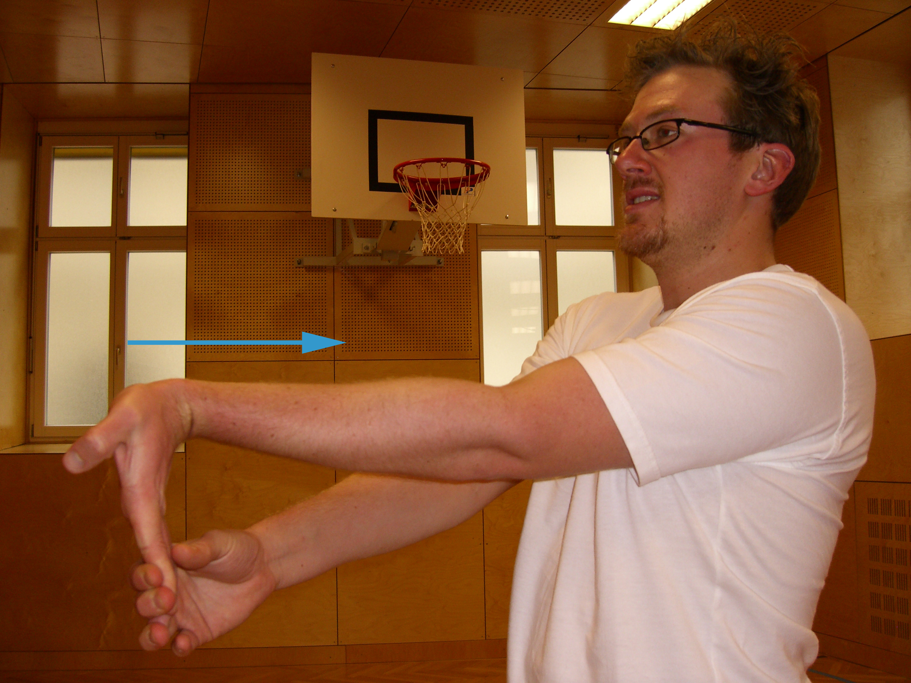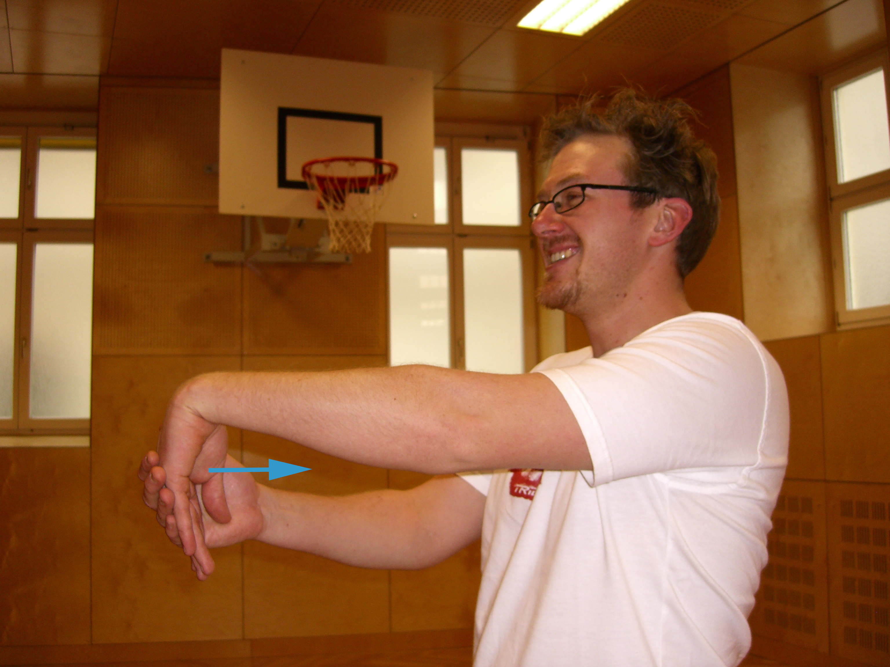Für diese Übung streckst Du den Arm aus und dehnst den inneren Unter- und Oberarm, indem Du den Handrücken zu Dir ziehst. Die Spannung geschieht wieder durch das Drücken gegen den Zug der anderen Hand – wie, wenn Du das Handgelenk strecken wollen würdest. Danach sind wir wieder in der Standard-Prozedur des Atemrhythmus.